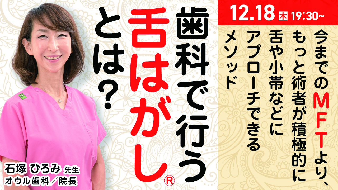 「舌はがし」という奇抜なネミングですが、手指で行う口腔内マニュピュレーションです。 くいしばり等で硬くなった口腔周囲の筋肉や粘膜をリリースして、唇・頬・舌が正しい位置で、独立かつ連携して機能できるようにすることが目的です。 特に舌のポジションは滑舌や発音、嚥下、呼吸に大きな影響を与え、頭蓋顔面の成長を正しい方向に導く大きな決め手になっています。今までのMFTより、もっと術者が積極的に舌や小帯などにアプローチできるメソッドです。